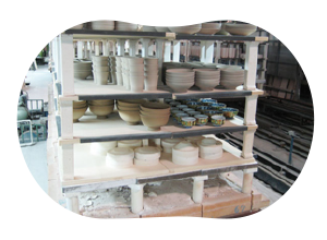 下絵や釉薬を塗りやすくするため、生地を約900℃、26時間焼きます。素焼き後、スタッフが、切れ・割れ・歪みを点検します。